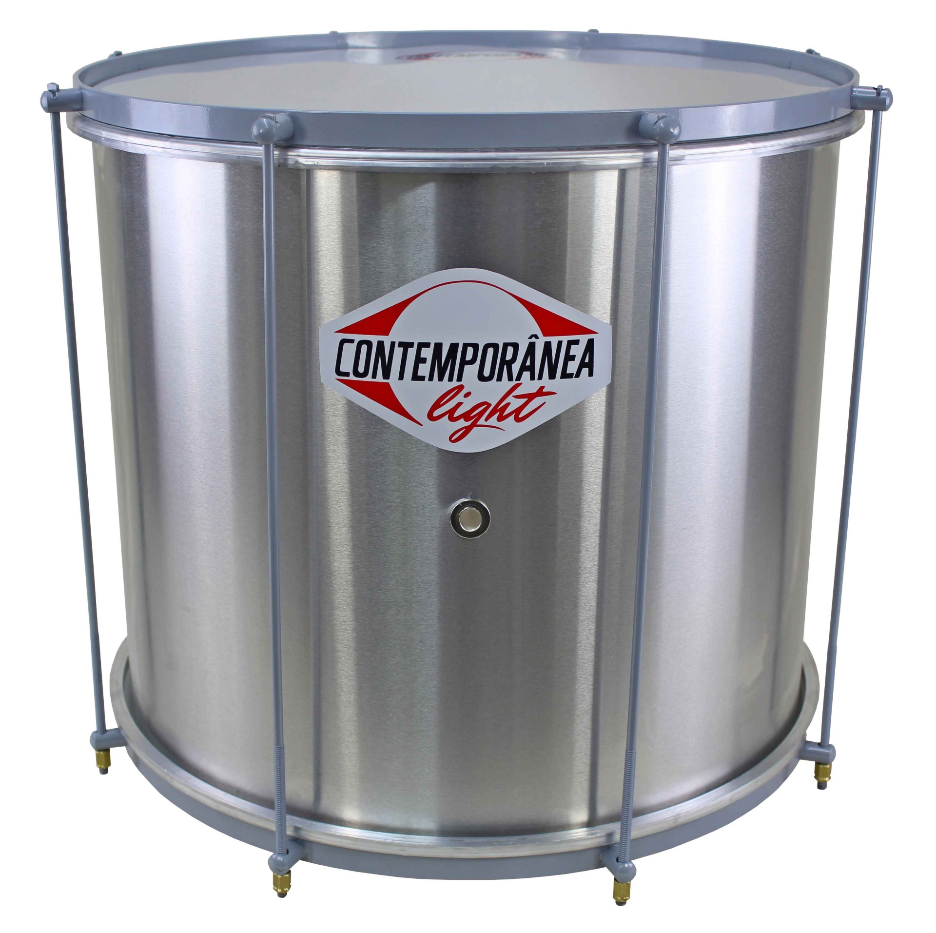 Tambor metálico prateado com texto CONTEMPORÂNEA Light
