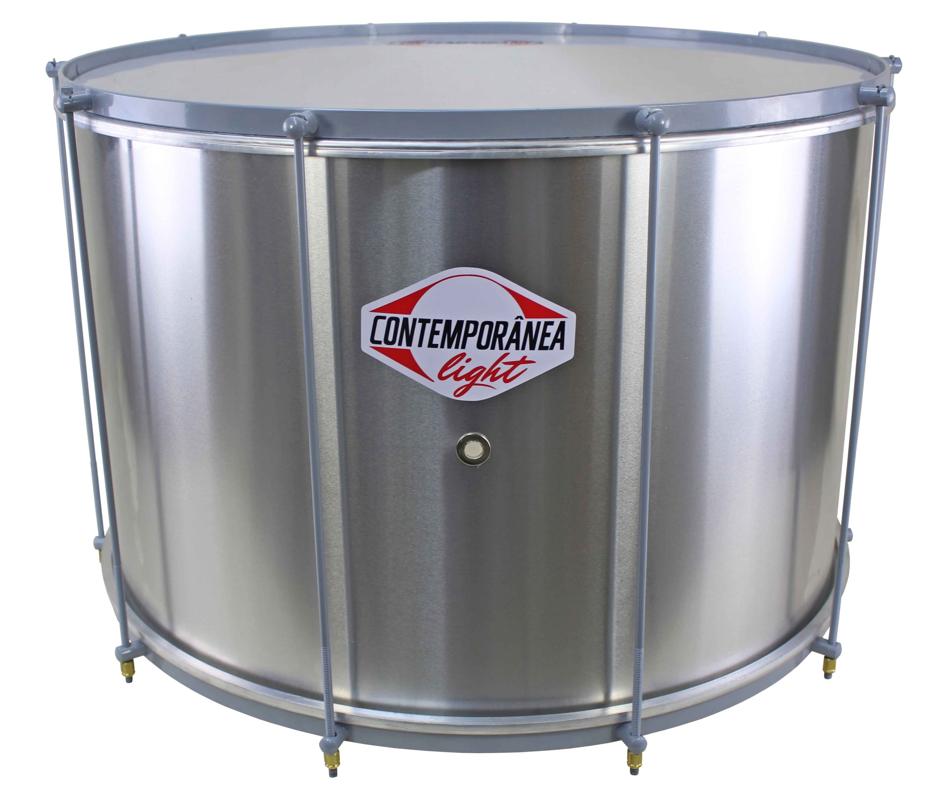 Tambor metálico prateado com armação em metal e etiqueta CONTEMPORÂNEA light