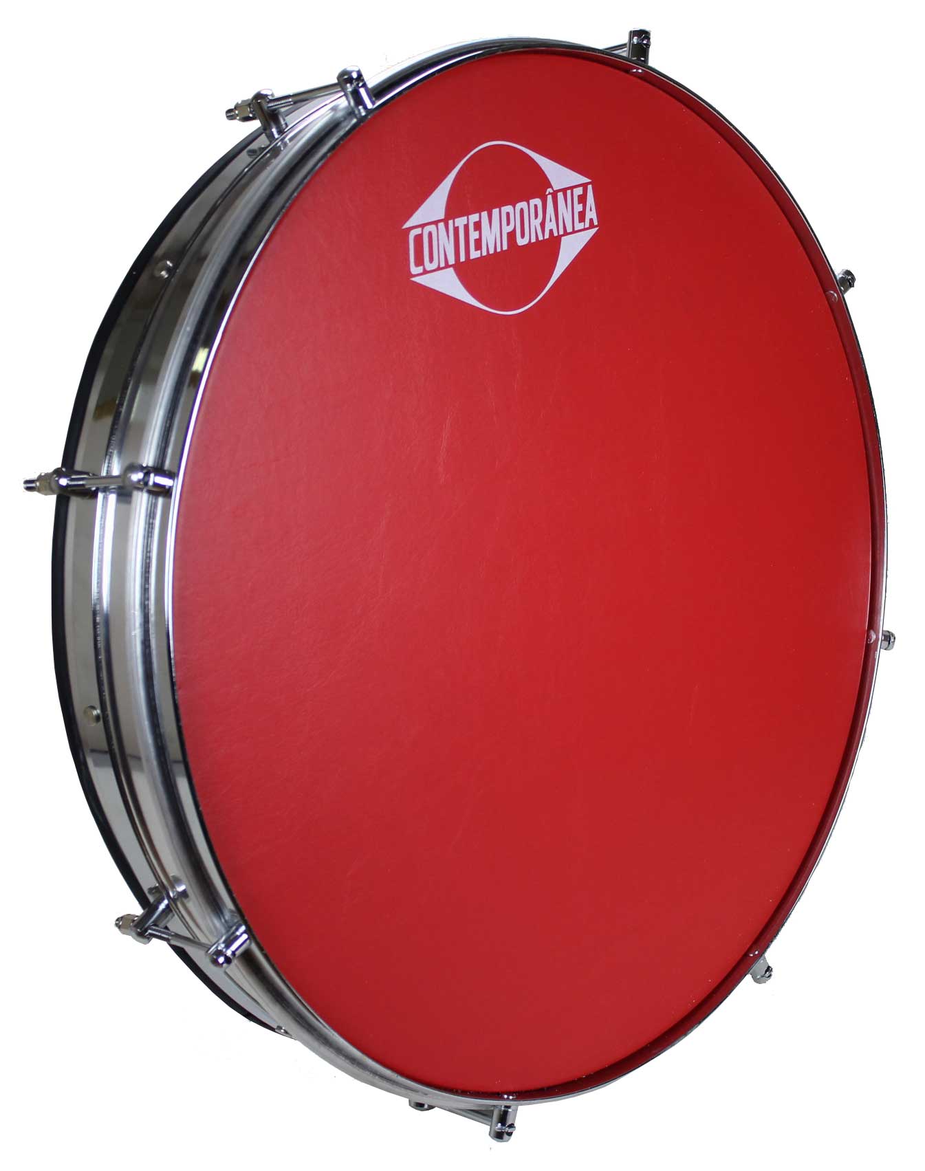 Tambor vermelho com aro metálico e texto CONTEMPORÂNEA