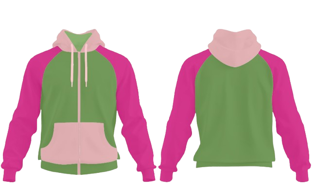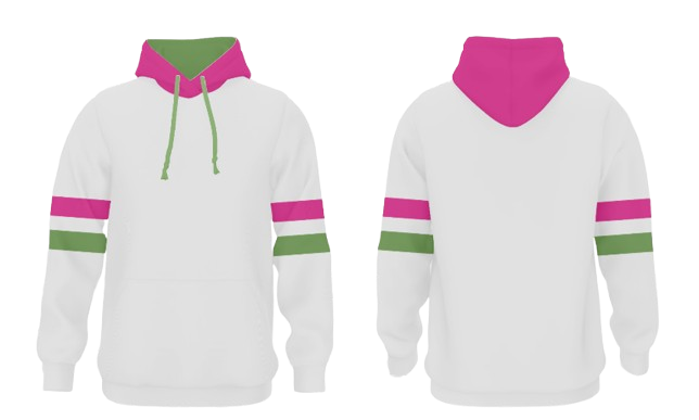 Camisola branca com capuz rosa e riscas rosa e verde nas mangas