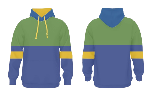 Camisola com capuz bicolor verde e azul com detalhes amarelos