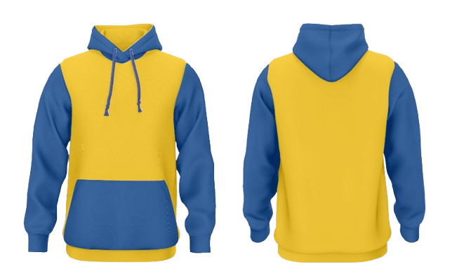 Sweatshirt com capuz azul e amarelo, vista frontal e traseira