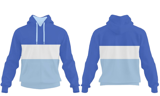 Casaco com capuz azul royal, branco e azul claro de frente e atrás