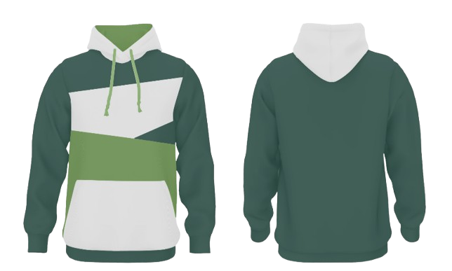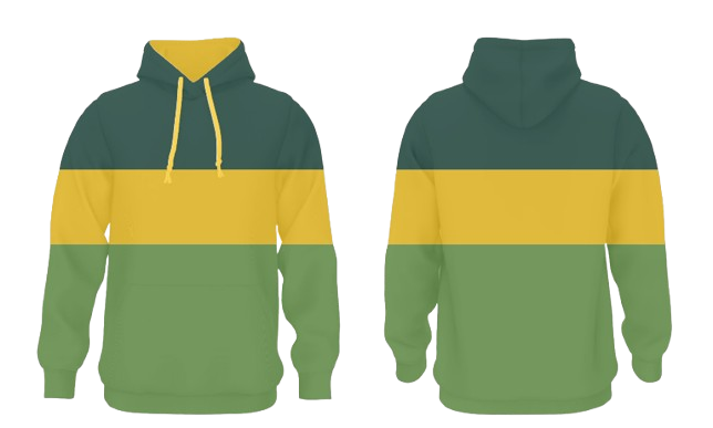 Camisola com capuz de três faixas horizontais verde-escuro, amarelo e verde claro