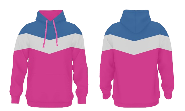 Camisola com capuz azul, branco e rosa com padrão chevron