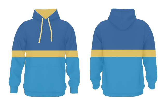 Sweatshirt com capuz azul com faixa amarela e cordões amarelos.
