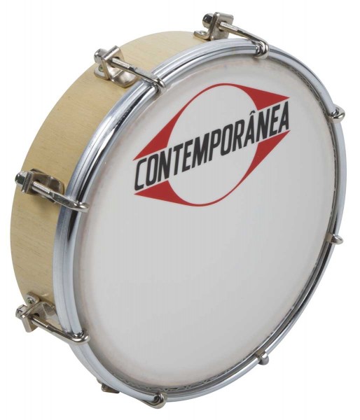 Pandeiro de madeira clara com pele branca e aro metálico com logo CONTEMPORÂNEA