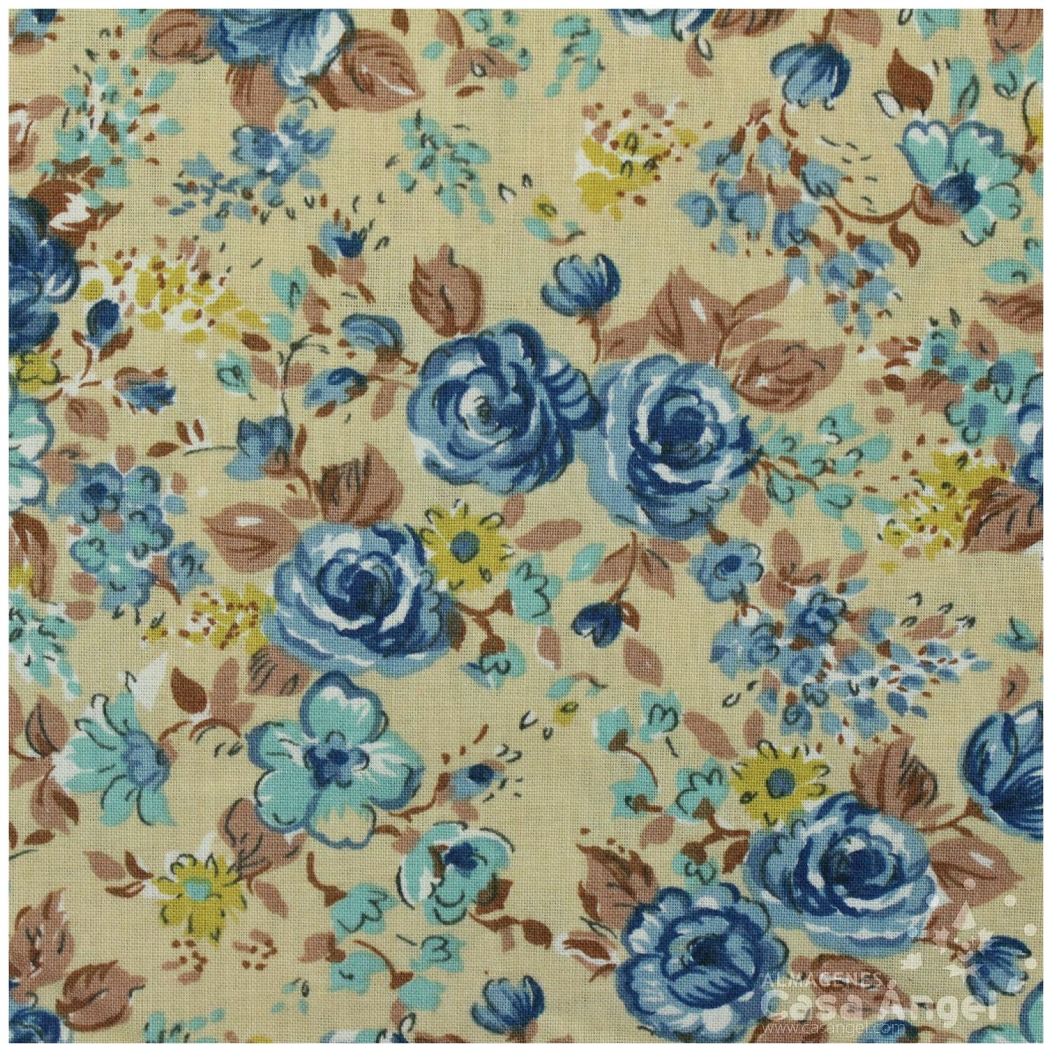 Tecido com padrão floral azul, amarelo e castanho sobre fundo bege