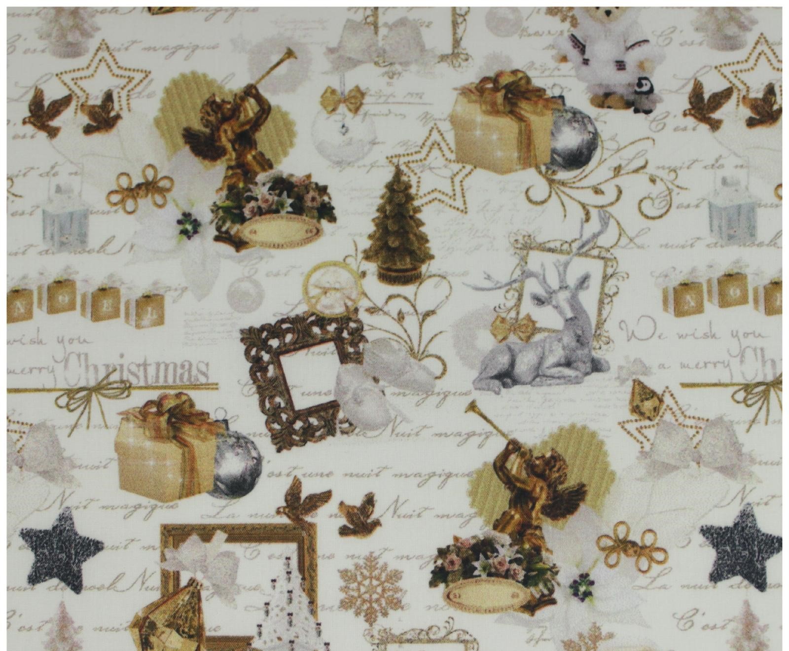 Pano branco com padrão natalício dourado e cinza com anjos, renas, estrelas, presentes e texto