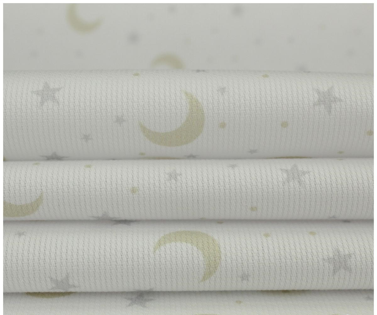 Tecido branco com padrão de luas e estrelas em amarelo e cinzento.