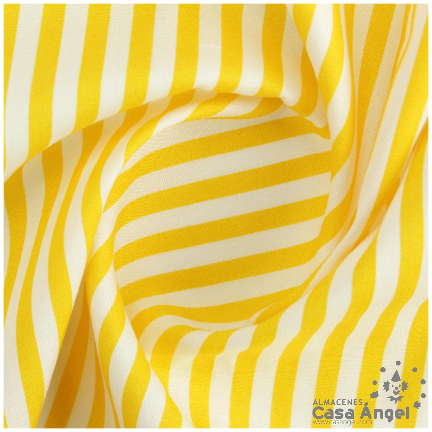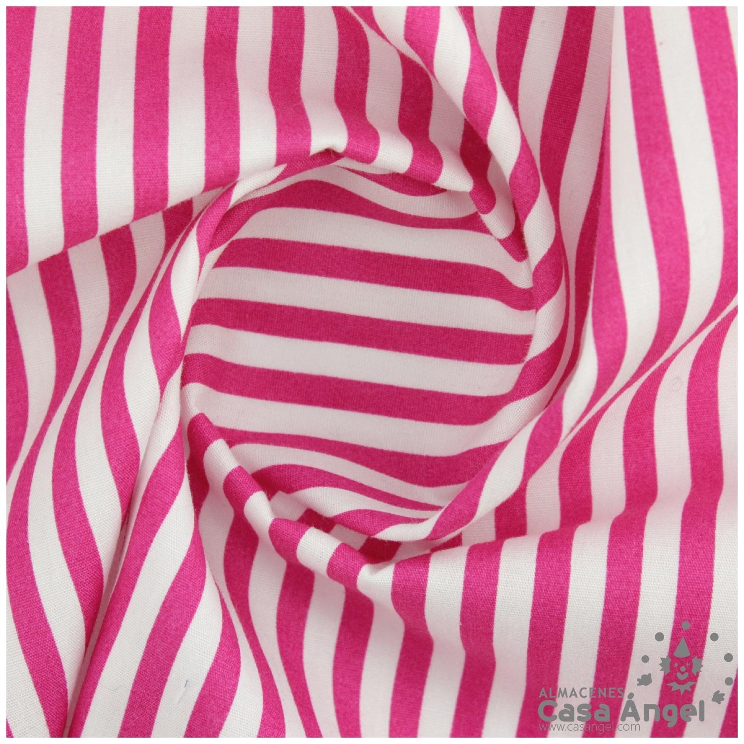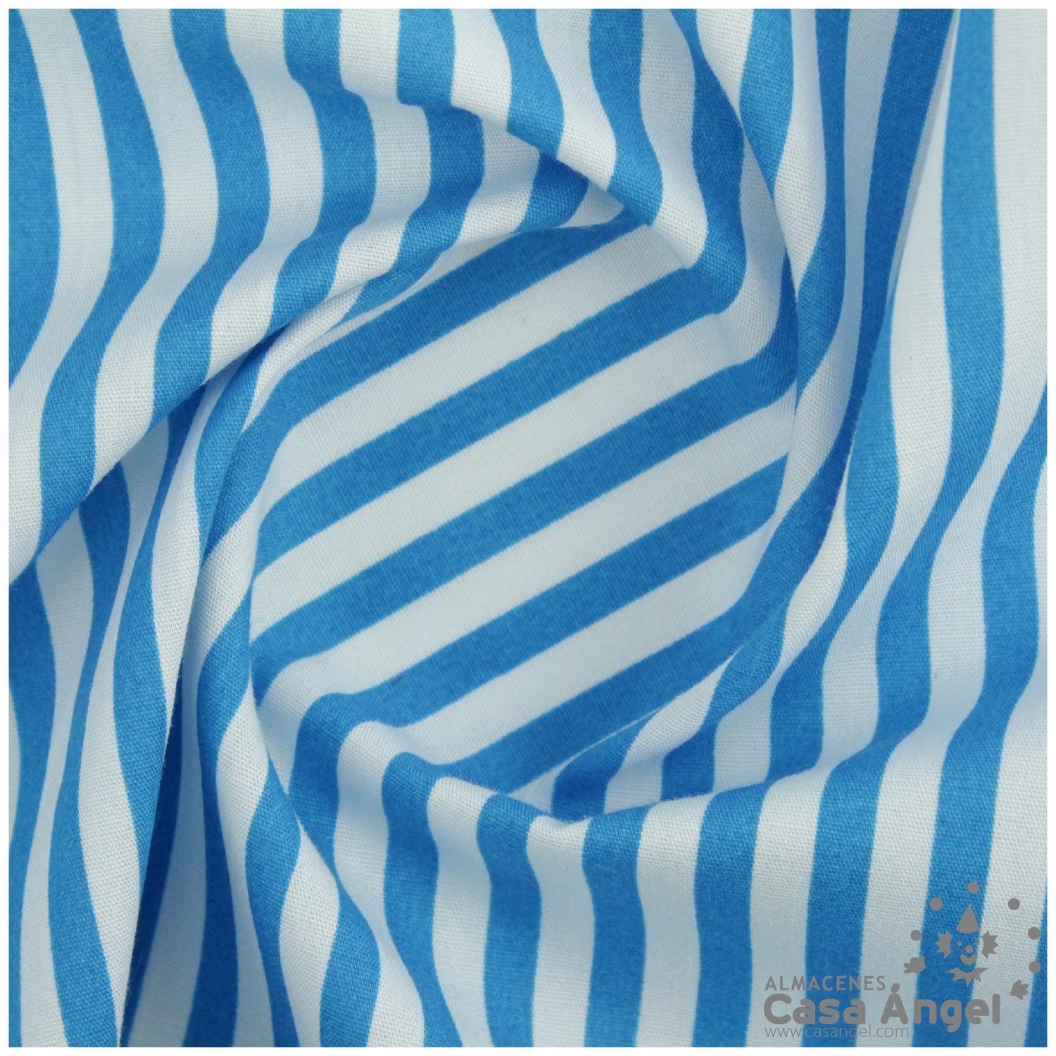 Tecido de algodão azul e branco com riscas verticais e etiqueta 'ALMACENES Casa Angel'