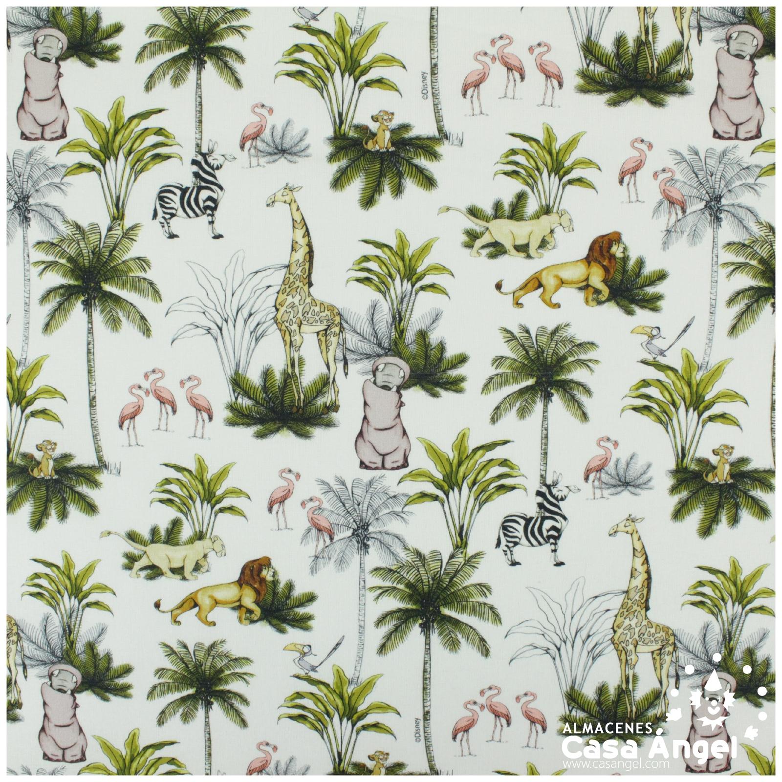 tecido com padrão de animais da savana e vegetação sobre fundo branco