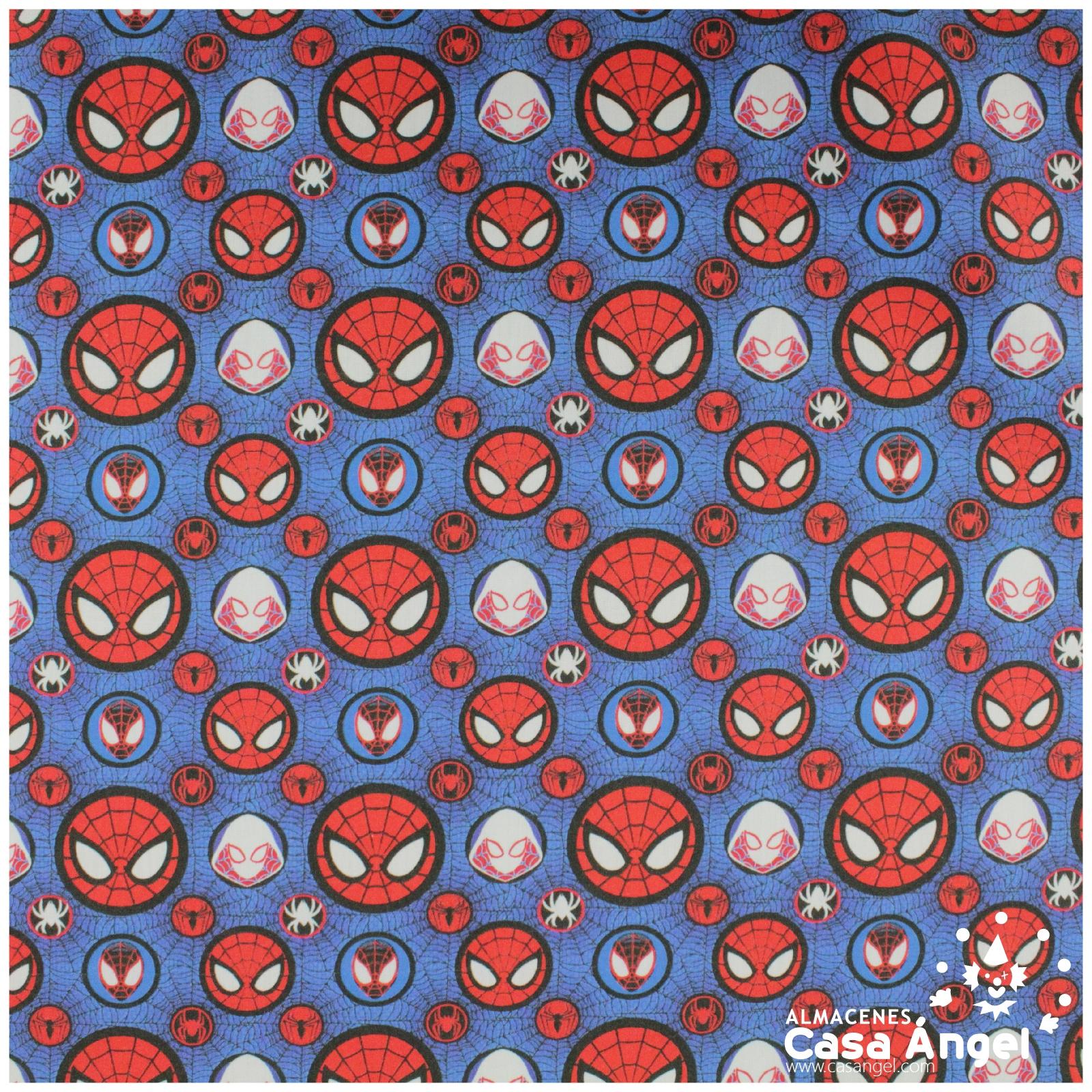 Tecido azul com padrão de rostos do Homem-Aranha em círculos coloridos