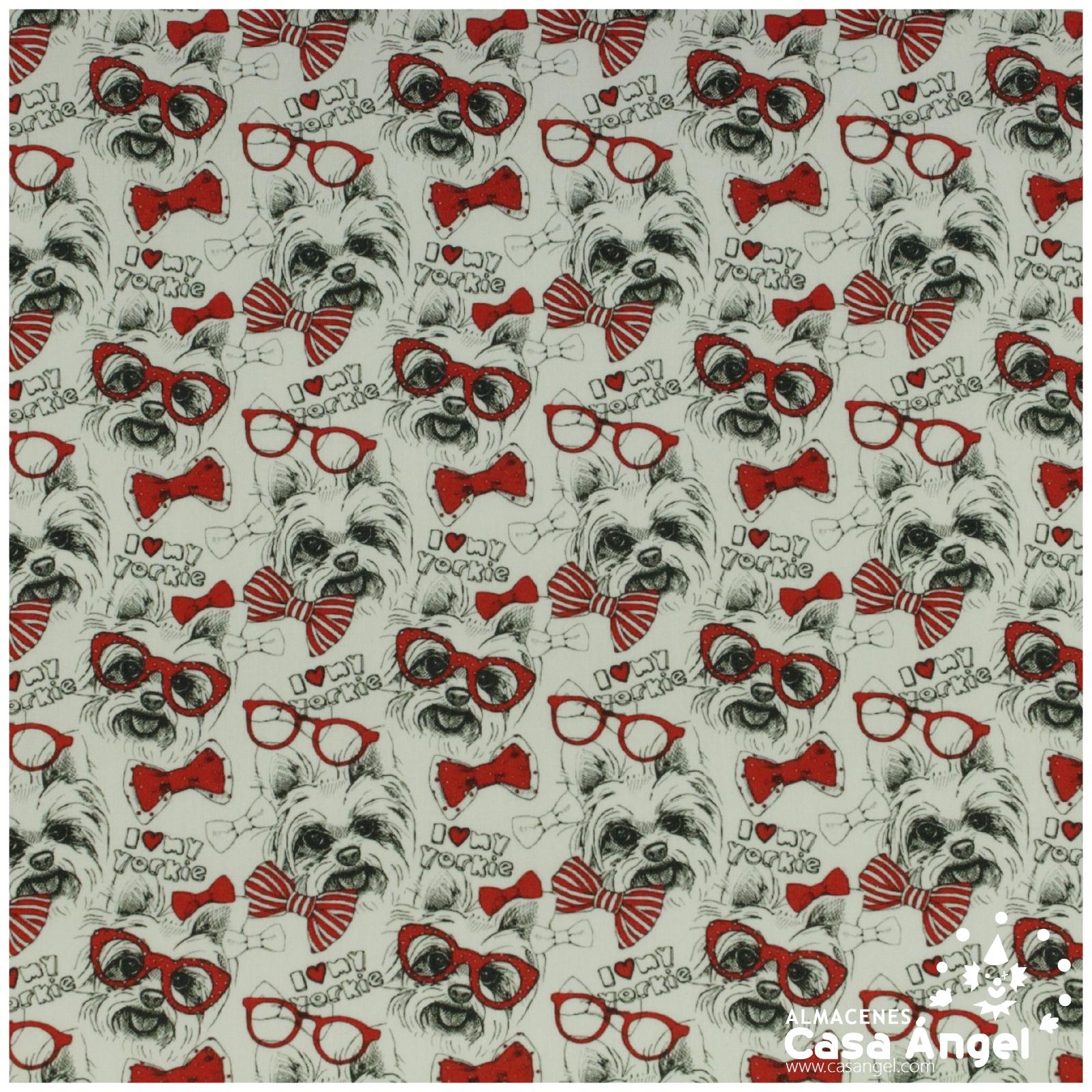 Padrão de tecido com ilustrações de cães, óculos vermelhos, laços vermelhos e texto I LOVE DOGS