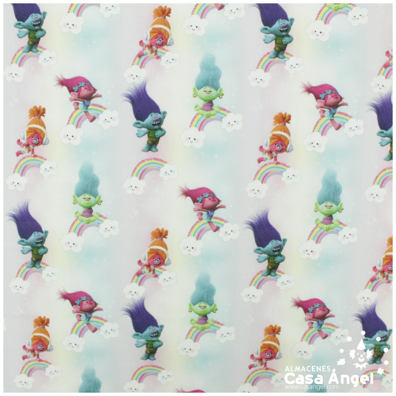 Papel de parede infantil com personagens coloridos de trolls e arco-íris.