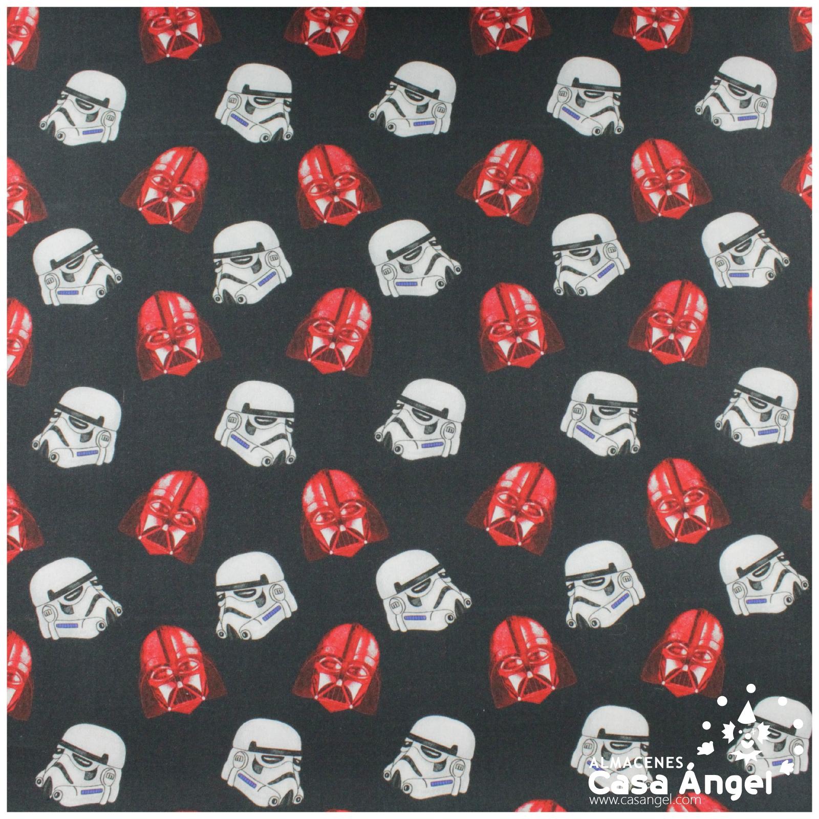 Tecido preto com padrão de capacetes de Stormtrooper brancos e Darth Vader vermelhos