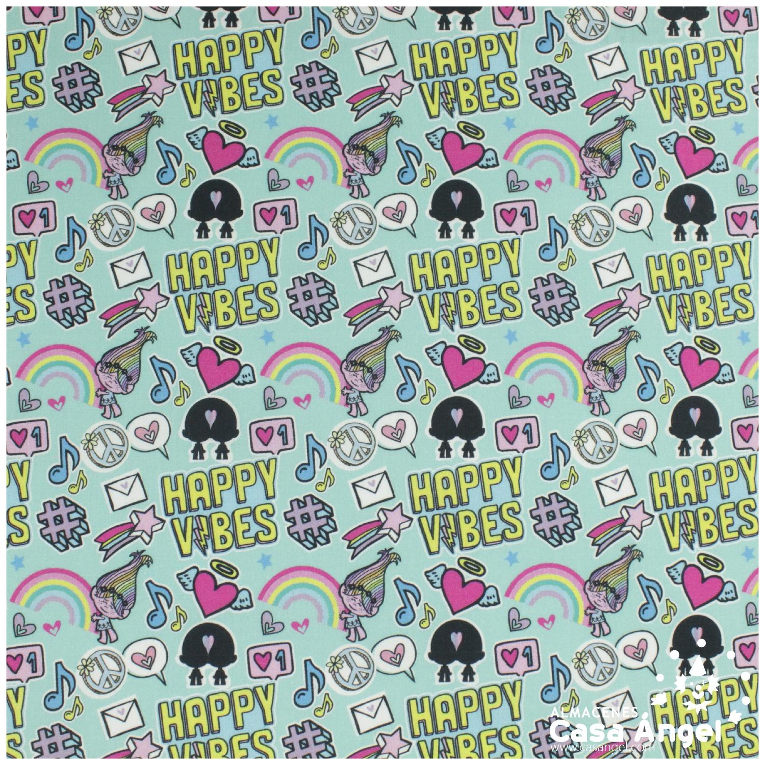 Padrão colorido com elementos de redes sociais e texto HAPPY VIBES