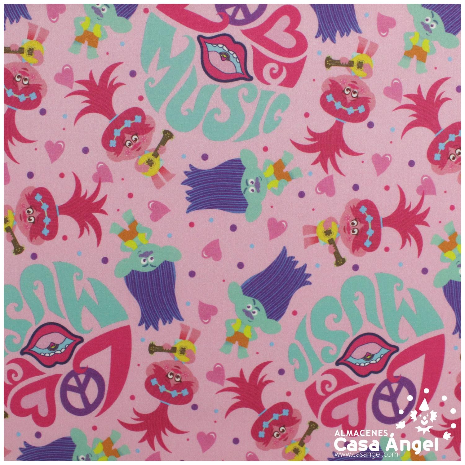 Tecido rosa com padrão de personagens coloridos e símbolos, com logo Casa Ángel