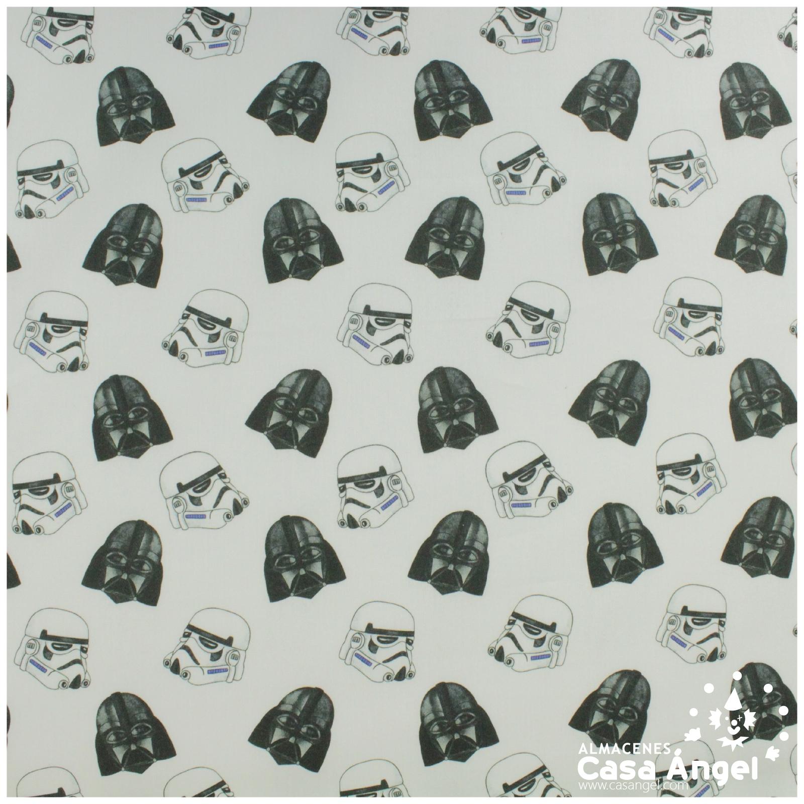 Tecido branco com capacetes de Star Wars em padrão repetido