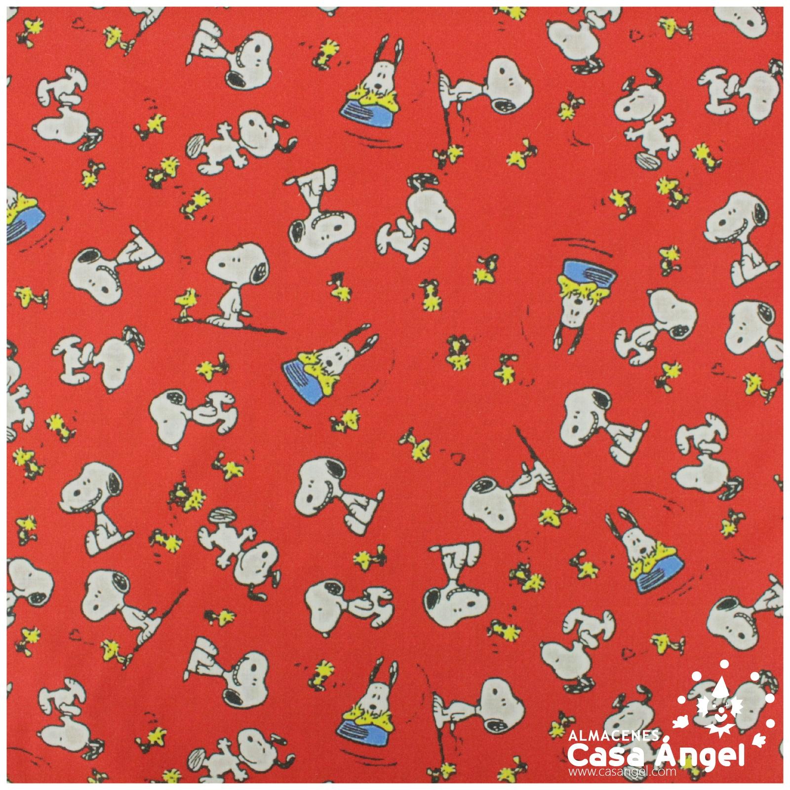 Tecido vermelho com padrão dos personagens Snoopy e Woodstock