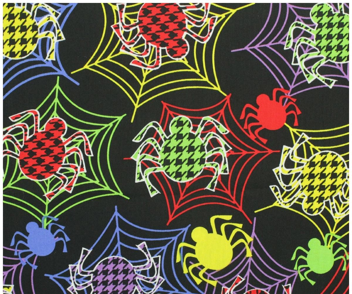 Pano preto com padrão colorido de aranhas e teias
