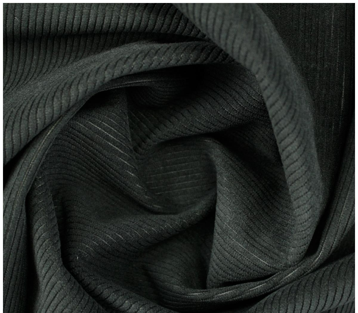 Tecido de veludo cotelê preto com textura de riscas verticais e dobras.