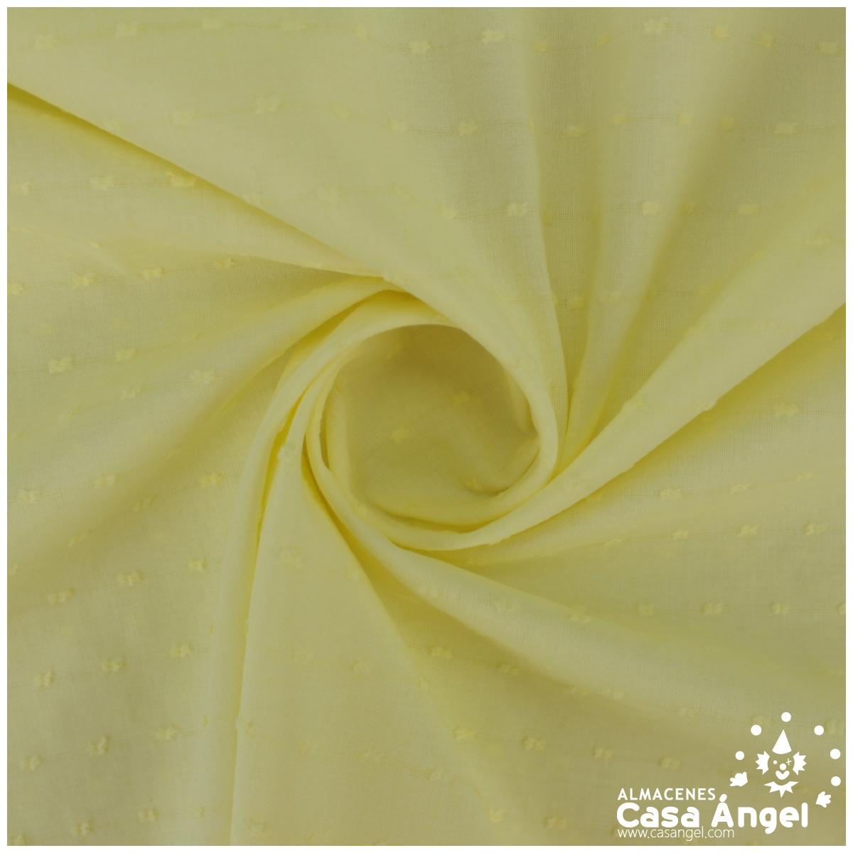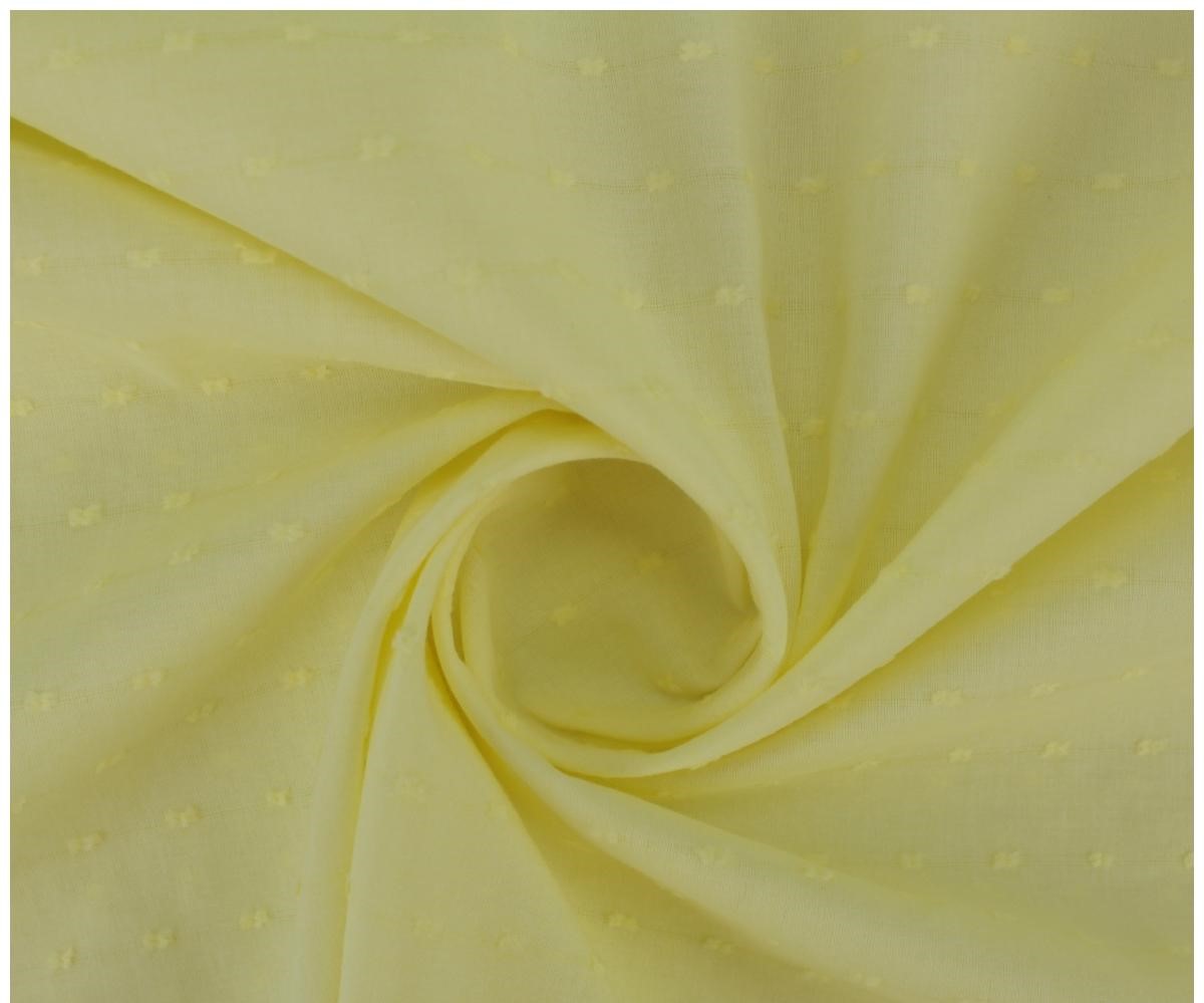 Tecido amarelo claro com textura e padrão de pequenos desenhos enrolado no centro