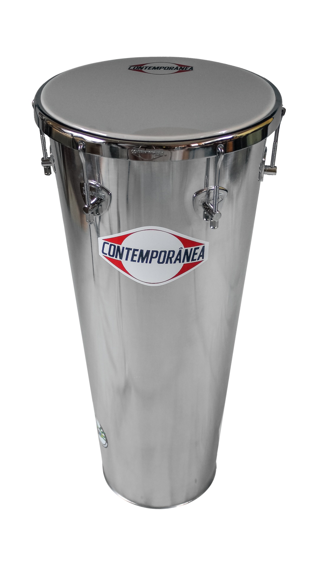 Atabaque de metal prateado com pele branca e rótulo CONTEMPORÂNEA