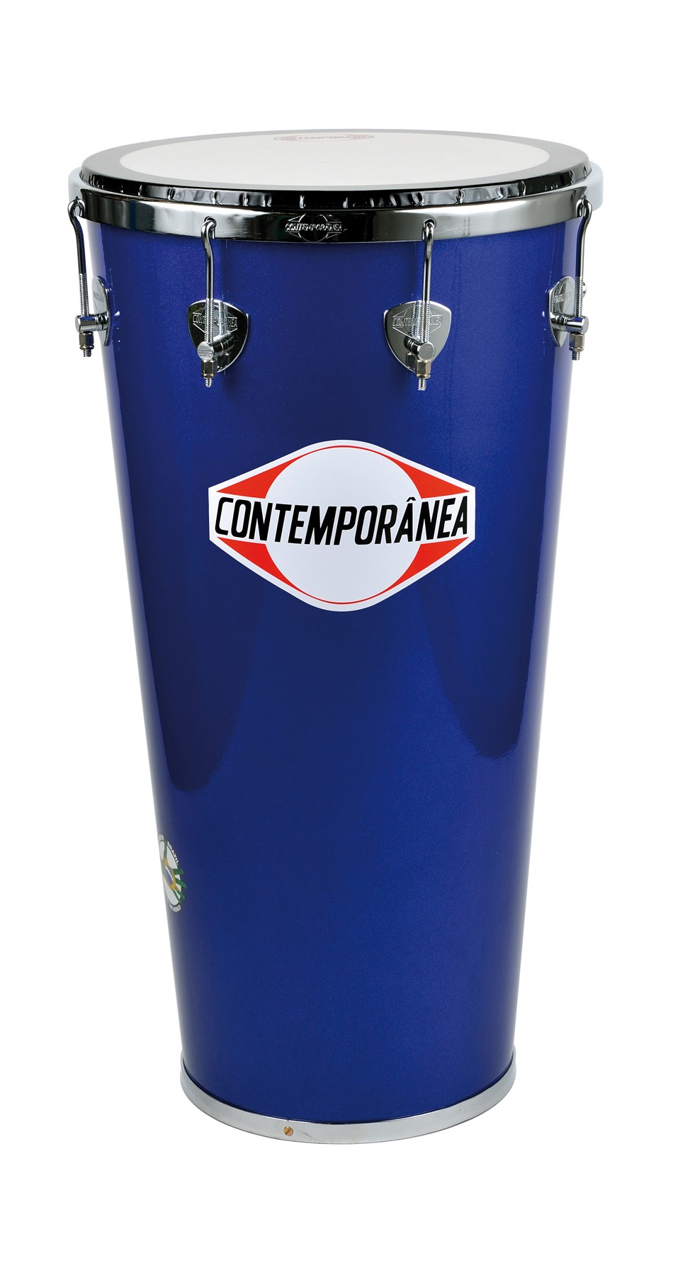 Tambor conga vermelho com marca CONTEMPORÂNEA em fundo branco