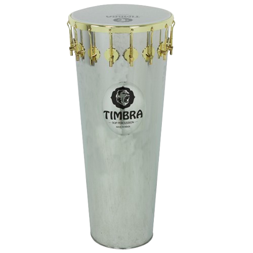 Conga metálica prateada com ferragens douradas e pele branca superior, com texto TIMBRA visível