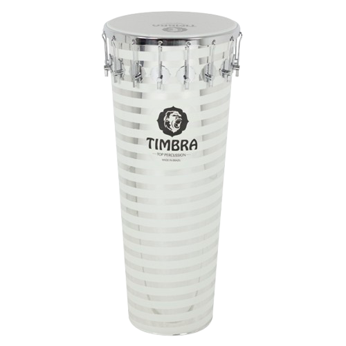 Tambor de percussão branco com riscas cinzentas e logotipo TIMBRA