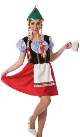 Mulher com fantasia tradicional e chapéu verde segurando uma caneca branca