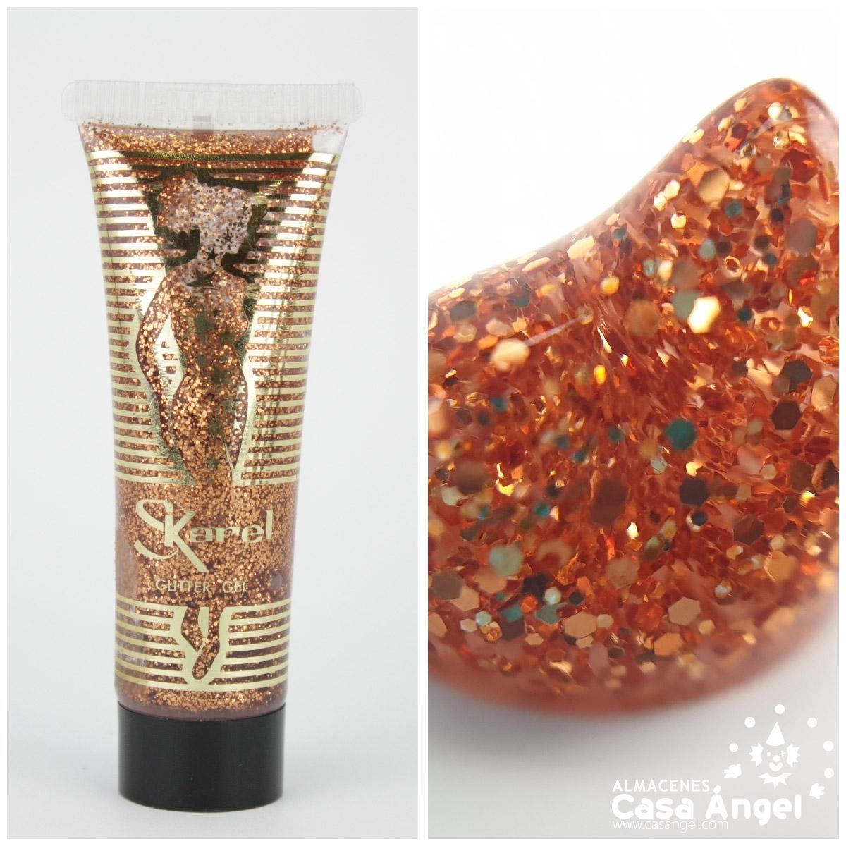 Tubo de gel cintilante Karel com glitter dourado e laranja e silhueta feminina