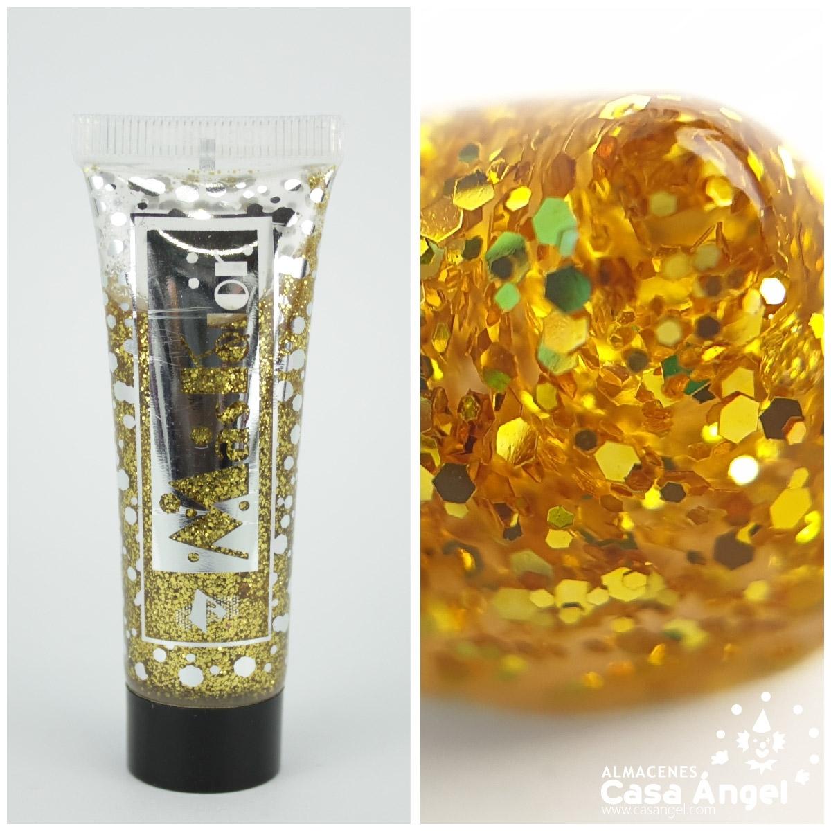 Tubo de gel dourado com purpurina e texto METALIC