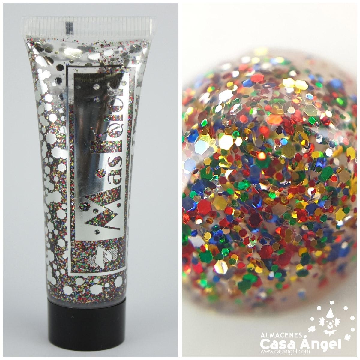 Tubo plástico transparente com glitter multicolorido e texto '7 Masque'