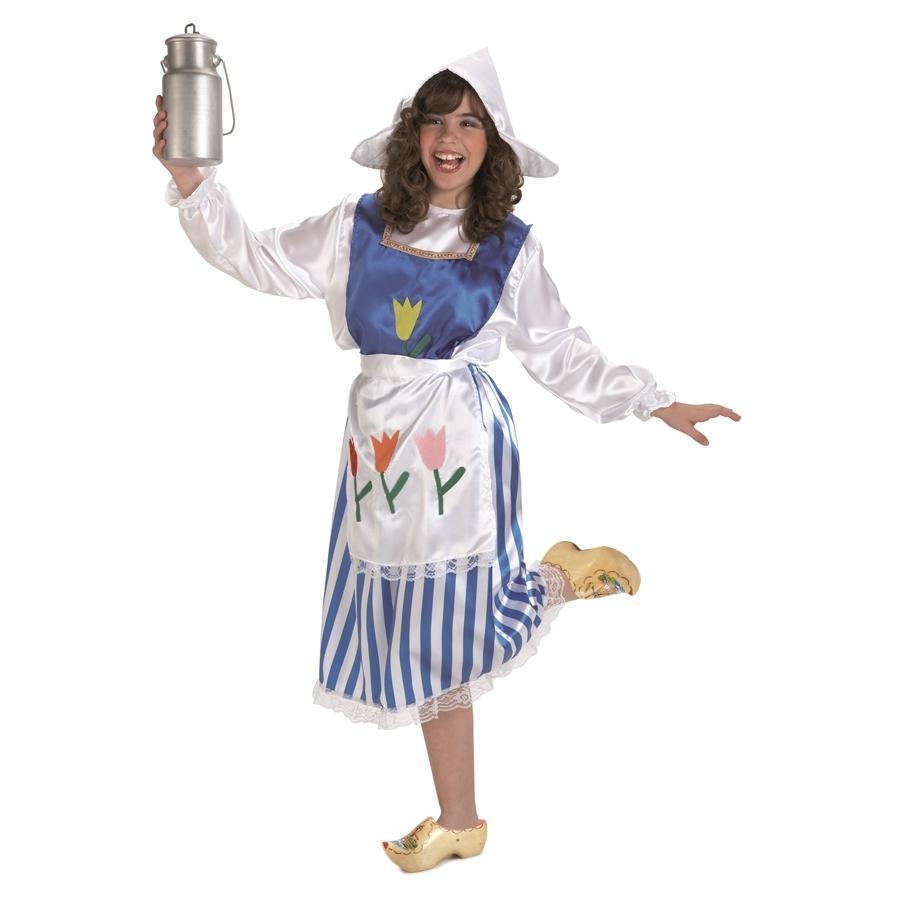 Fantasia tradicional feminina com avental de flores, saia riscada, camisa branca, sapatos de madeira e cantil metálico