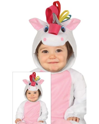 Criança com fato de unicórnio branco e rosa com chifre prateado e crina colorida