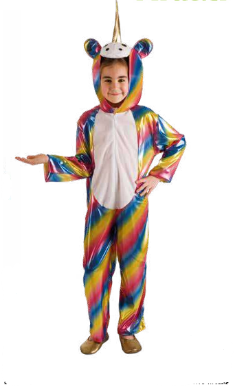 Fato de Carnaval infantil unicórnio colorido metálico com chifre e capuz