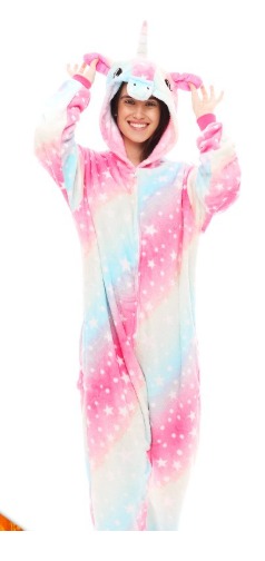 pessoa com pijama de unicórnio colorido com estrelas e capuz