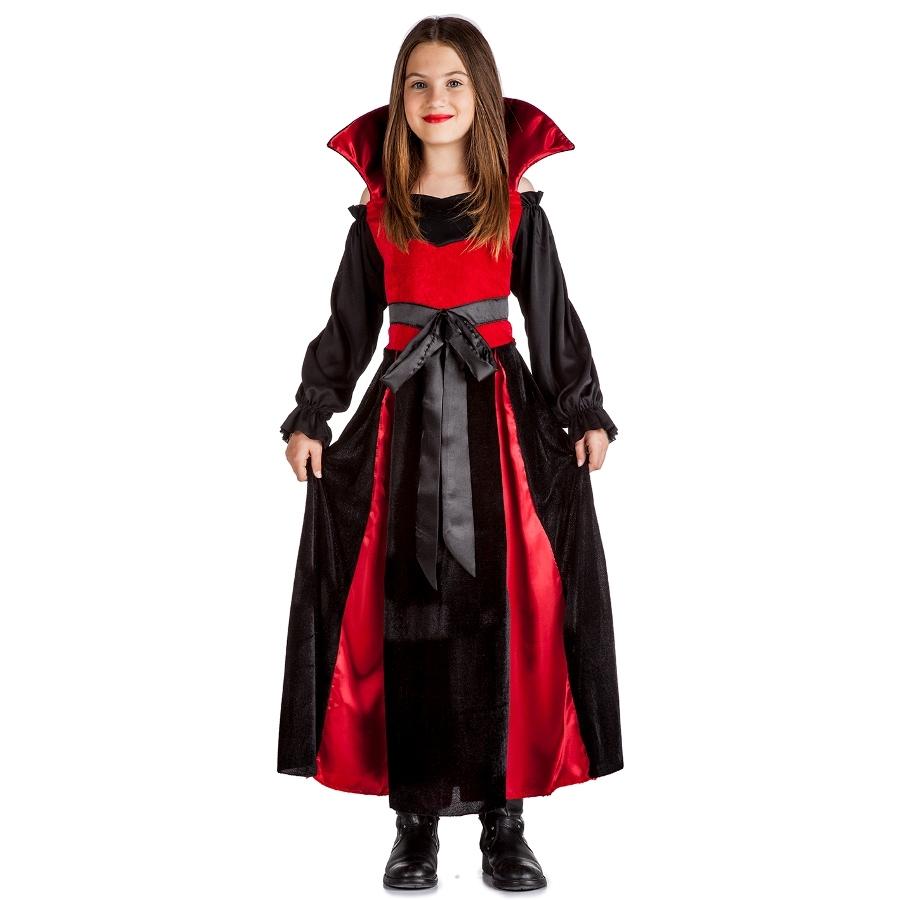 Menina com vestido de fantasia preto e vermelho com gola alta