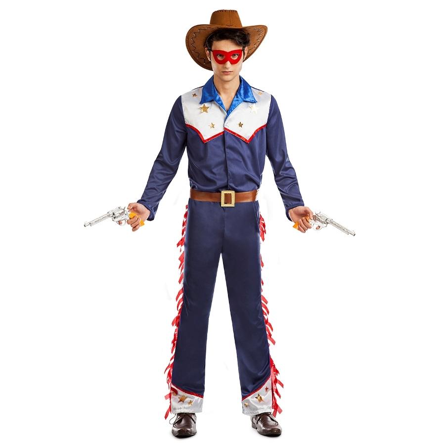Fato de cowboy azul com detalhes vermelhos e brancos, chapéu castanho, máscara vermelha e pistolas prateadas.