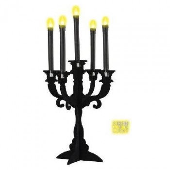 Castiçal preto de cinco braços com velas e luzes amarelas acesas