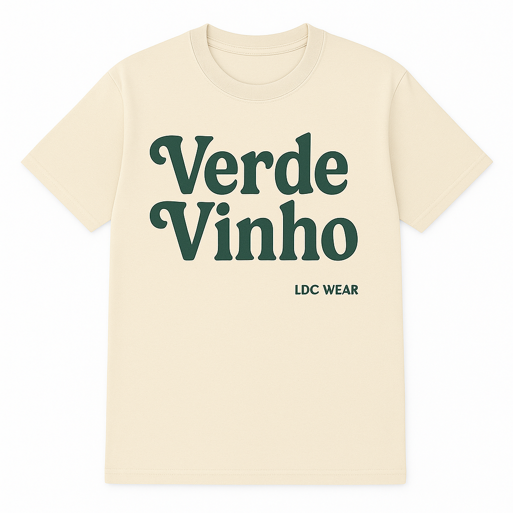 T-shirt bege clara com texto verde escuro 'Verde Vinho' e 'LDC WEAR'.