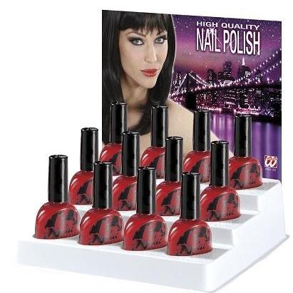 Expositor de verniz de unhas vermelhos com cartaz de mulher e texto 'HIGH QUALITY NAIL POLISH'