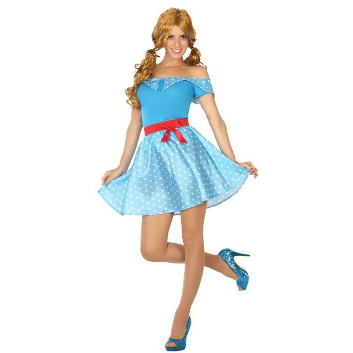 Vestido azul claro com bolinhas brancas e cinto vermelho
