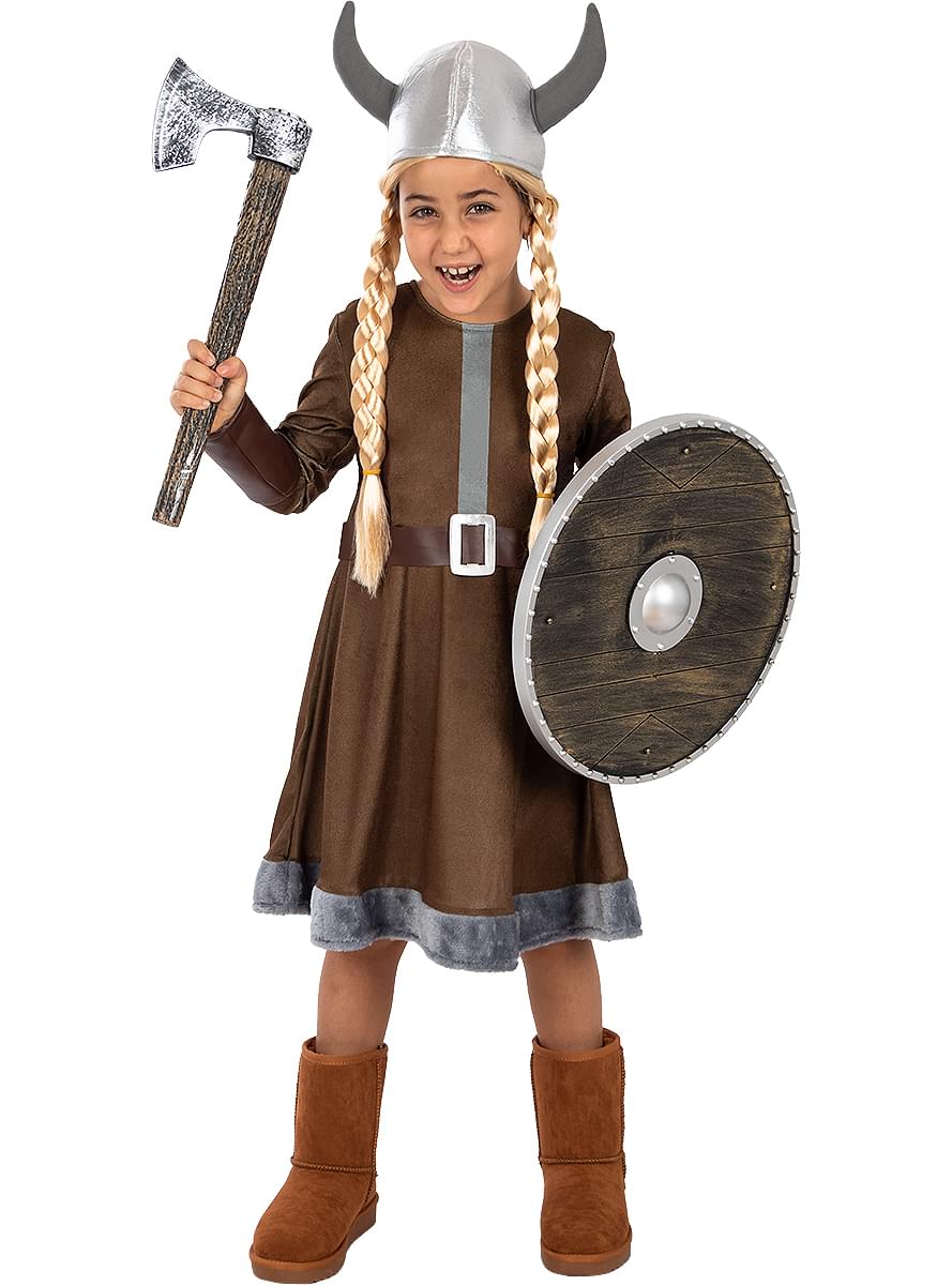 Menina em traje de Viking com vestido castanho, capacete, escudo e machado.