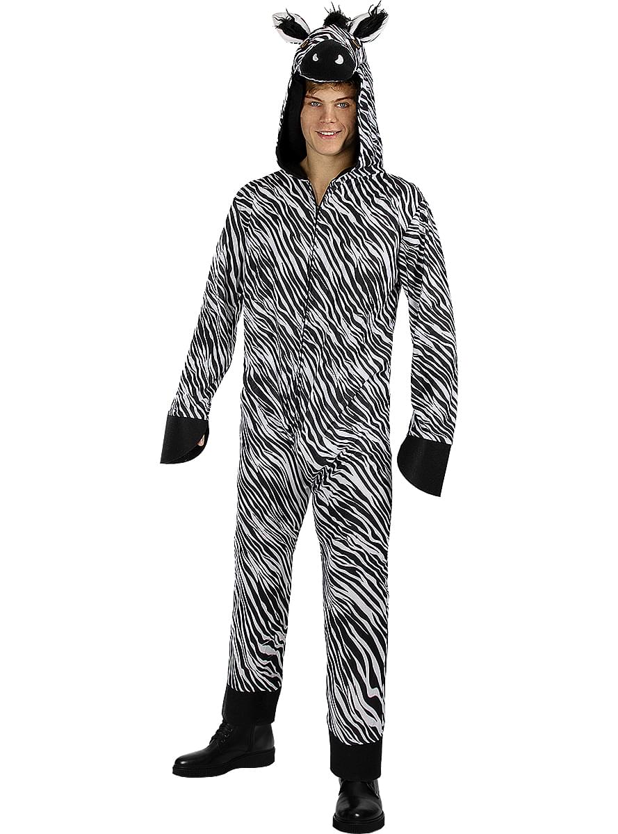 Pessoa usando macacão de zebra com capuz 3D e punhos pretos